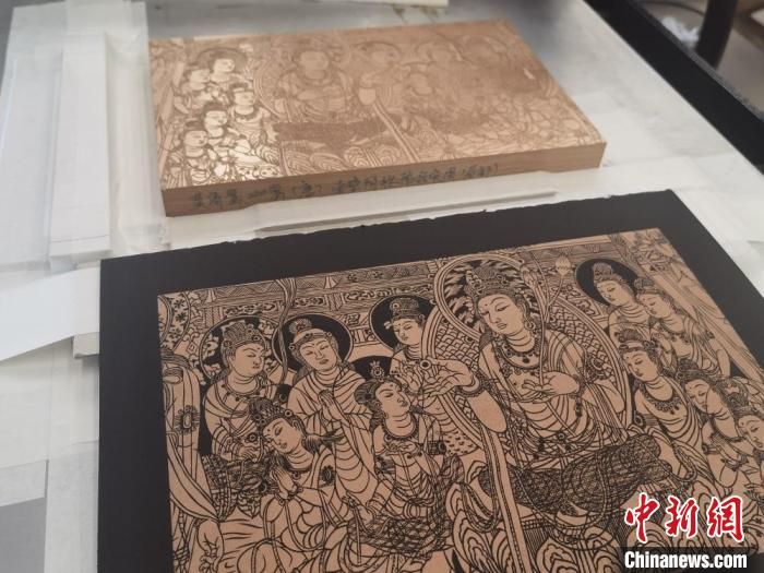 “将敦煌壁画浓缩雕刻在木板上难度非常大,飞天裙裾要飘逸,菩萨的眉眼要有神,一刀都不能雕错。”徐晋林最近刚完成以莫高窟444窟和57窟的壁画为原型的雕版画,目前累计完成上百件敦煌题材的雕版画。