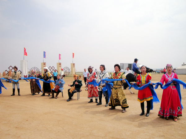 长调民歌(本栏有专文介绍),在蒙古草原长期流传过程中,已成完整体系,主要包括草原牧歌、赞歌、思乡曲、婚礼歌、情歌、酒歌等。长调民歌音域宽广,曲调优美流畅,旋律线多作波浪式行进,起伏跌宕,以展示天高地阔的草原仙境。节奏悠长,腔多词少;将陈述性的语言节奏、抒情性的悠长节奏、装饰性的“诺古拉”节奏巧妙组合,构成长调民歌特有的律动状态。如《富饶辽阔的阿拉善》《轮番酒之歌》《查干套海》《辽阔的草原》《小黄马》《思乡曲》等【刘军供图】。