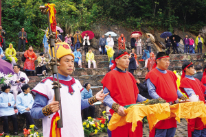 烟雨迷蒙中,头饰百合花的童男童女,手捧水果篮的少男少女,以及身着传统服饰的老年男女等,在祭师的带领下鱼贯进入祭祀场。