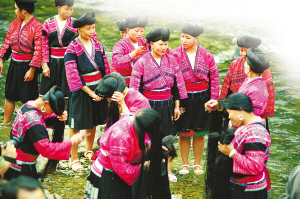 红瑶女子的长发平均在1.4米以上。村寨前后的河滩边、泉水边,就是她们的天然梳妆台