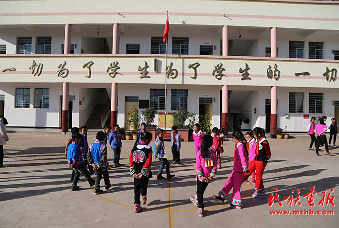 看过腊湾民族小学课间操的人都会说:“腊湾民族小学的课间操都是跳出来的。”然而,对于这所双语教学的民族小学来说,其民族特色远不止于此。穿彝族传统服装、讲彝语也是这里的教育特色。