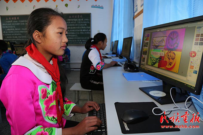 腊湾民族小学五年级的学生在上计算机课,李欣洁同学在认真地制作PPT