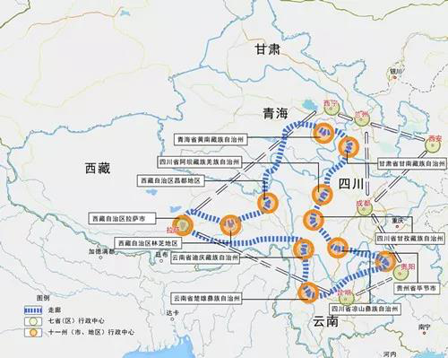 藏羌彝文化产业走廊依托的城市枢纽包括:四川省成都市、贵州省贵阳市、云南省昆明市、西藏自治区拉萨市、陕西省西安市、甘肃省兰州市和青海省西宁市。