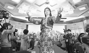 2012年12月,由全国《格萨(斯)尔》工作领导小组办公室、青海省《格萨尔》工作领导小组办公室等联合主办的中国·青海·果洛《格萨尔》艺人成果展暨圆光中的《格萨尔》史诗艺术展在北京举行。图为开幕式上模特在展示《格萨尔》史诗中所描述的民族传统服装。 资料图片