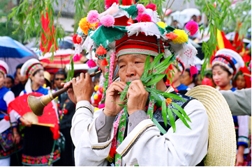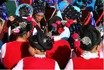 新娘的首饰主要由耳环、银镯、针筒银链和戒指等构成,其中银质手镯和针筒银链大都出自本地工匠之手。主要是因为在鹤庆以北的新华村早就是闻明世界的制银之乡,银手镯一般分为“细丝”、“粗丝”和“粗夹细”三种。细丝就是用较细的银丝(直径0.1厘米)制作成直径为l.5厘米的绳状手镯;粗丝则用0.2厘米银丝做成;粗夹细是用上述两种银丝混合制做而成的。银手镯式样的选择取决于新娘的喜欢。而针筒银链长40厘米,它是由l2条银链排列组合,在银链的中段有“石锁”状的饰物连接下部,银链下端缀有栩栩如生的十二生肖属相,针筒银链挂在胸的左前侧,但也有挂红色或绿色方巾的,即实用,又能起装饰作用。耳环、戒指和玉镯等其它饰件一般由自己准备,但也有亲友赠送的或是由婆家送的。整套服饰有容华贵,明快之中显素雅,绣艳之中见端庄。
