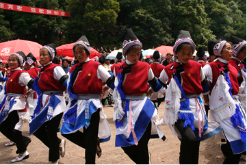 以大理市为主要代表的洱滨区白族服饰。如周城、喜洲、挖色等白族服饰,他们世代伴水而居,生活环境十分优越,服饰给人一种清新明快的感觉。在很大程度上折射出这种环境的优越性,周城村白族男服饰过去的穿着较为复杂,缠白布包头,上衣穿立领对襟布纽衣,俗称“三滴水”,最里的一件穿白色、中间一件穿蓝色、最外一件穿黑色或是藏青色的外衣,三件衣服都是敞开着,露出内穿的兜肚,外穿一件麂皮或山羊皮的领褂,下穿白或蓝色大裆裤,脚穿布底剪口鞋。肩挂绣花挂包。而现在的男装基本与汉族相同,平时需要穿戴的民族服装也是改良过较为简洁的男装,只有在重大节日的时候才能看到传统的着装风采。而女装的穿戴至今还保持得较为完整,以白、蓝两色为主,沿承了白族崇尚白色的传统特点,上身穿白色紧袖裳,外套红或蓝色右衽领褂,在领褂的纽扣上挂三须或五须银链,银链上缀挂件,有银质的针筒、鱼、牙签、耳勺。手戴金、银或玉手镯、戒指。耳戴金、银耳坠。手袖上套滚边的大袖小袖,并在袖上镶各式花边。腰系绣花短围裙或系净白色底外镶一圈黑色边的素面短围腰。下穿白或蓝色滚边长裤,裤腿边镶宽窄花边,花边上面绣各类花卉图案。脚穿绣花尖鞋,又名“白姐鞋”(“柏姐鞋”),鞋面为红、粉、绿、黑等色,绣有艳丽的花纹。头饰和过去的头饰相比较从美术的角度上看要美得多,特别是姑娘的头饰,过去传统头饰一般喜戴鱼尾帽,还有我们在电影《五朵金花》中所看到过的姑娘头饰,而今姑娘的头饰让人一看就联想到大理的“风花雪月”四大美景。头戴色彩鲜艳的绣花头巾,绣花头帕上端精心梳理出茂密雪白的绒毛,形象的表现了苍山顶上的皑皑白雪,将发辫盘绣花头帕外,缠以大红绒线,形如满月,一侧垂下雪白的缨穗飘飘洒洒,象征着终年吹拂的下关风。整套服饰在很大程度上折射出这种环境的优越性,如色彩搭配对比鲜明,简洁明快,挑花精美,毫无细碎之感,装饰繁而不俗等。