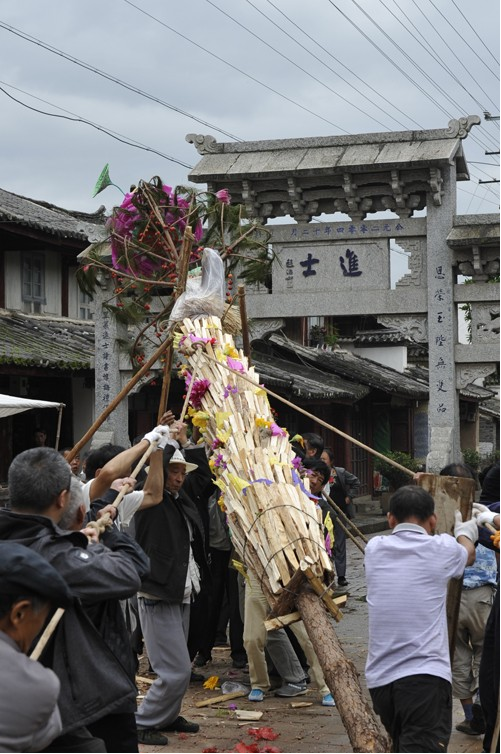 在剑川,都是由家里喜添子嗣的人家来筹备火把节的一切事宜,除了对新生儿的祝福,火把树的装扮也表示剑川人祈愿风调雨顺,人寿年丰、邻里和谐。火把要扎十二层(闰年要扎十三层),上面六层的明子和柴分别由细到粗,一层接着一层,下面七层都是一样的新柴。喻示每一个新的日子都红红火火。