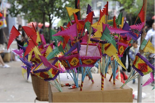 早上十点左右,火把就快扎好了。色彩鲜艳的纸裱斗升上各色卷着的彩旗正一个个被打开,梨、苹果、花红正被栓成一串串地挂在树枝上,水泥桌上摆着小旗、炒蚕豆和糖果等,老人们在一旁边笑边聊,一盘彩色米干在灿烂的笑着。