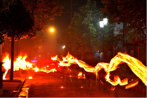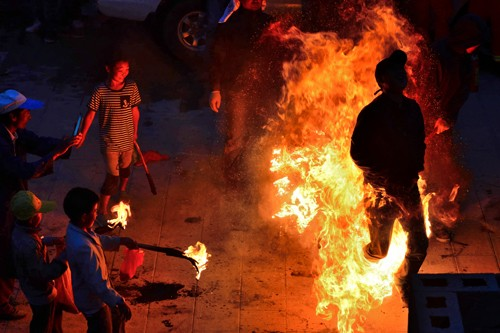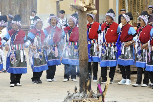 不到黄昏,鞭炮声就响起来了。新生儿的父亲点燃火把后,孩子们迫不及待地拿着小火把和松明粉,跑来跑去烧新生儿的的各种亲戚,大人们乐呵呵地接受孩子们喷洒过来的火焰,并一致说着很吉祥的祈愿祝福语。“从此晦气不在喽!”、“一年更比一年好呀!”、“红红火火又一年”。男女老少在火把树下吃喝玩乐,其乐融融。糖、炒蚕豆、梨、苹果等被大家传来传去,新生父亲挨个向亲友敬酒。亲友邻居喝着喜酒,一致祝福新生儿安康成长,将来富贵吉祥。