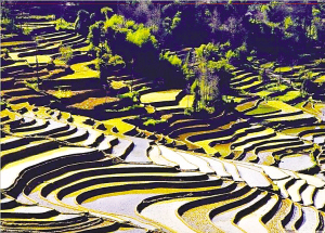 “万丈梯田,直扑云天,仿佛一道道天梯……”这些经典词汇,一但当人们赞美梯田时,就会不厌其烦地用上它们:“细碎精巧的涟漪……精净如鳞的波纹……金色的碎片缀满山体……满山流光溢彩……”但是,梯田的宁谧、静美,是属于前现代性的,当现代性在山脚窥伺并最终漫上梯田社会,一切都将发生改变。