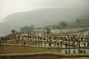 上午10点,由上千名当地哈尼族农民和彝族农民组成的表演团队,在20平方公里之广袤的梯田间开始载歌载舞,展现当地的少数民族放牛、插秧、抓鱼、婚礼等生产生活方式。梯田、森林、村庄、河流在1小时的演出中浑然一体,征服了当地群众和上千名中外游客。