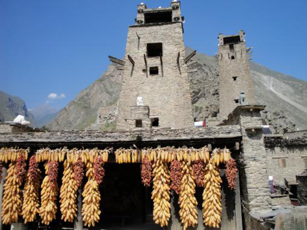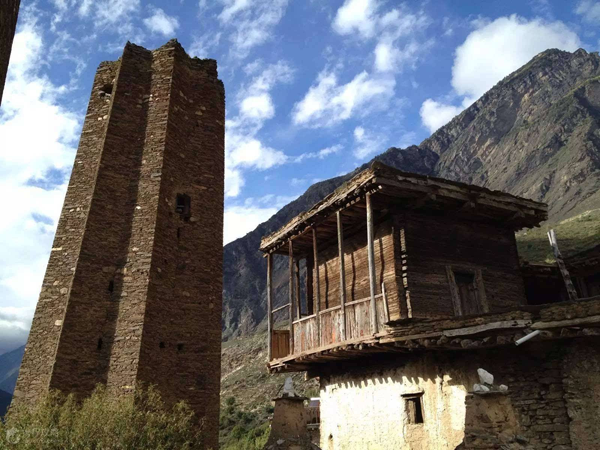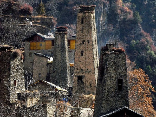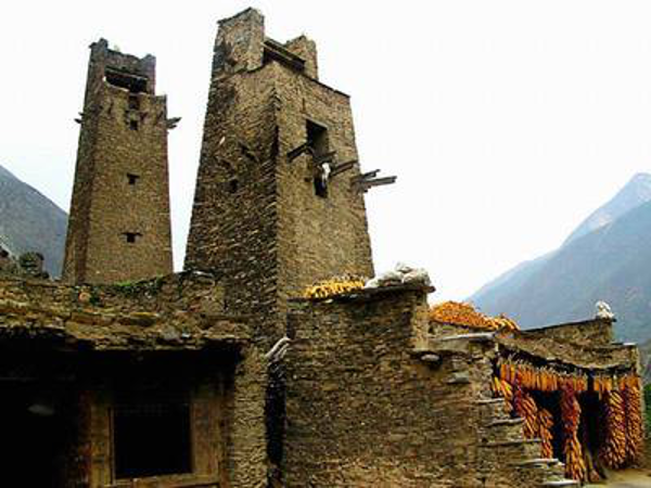 在羌语中,碉楼被称为“邛笼”,意为美丽、高贵的房子,早在2000年前《后汉书·西南夷传》就有羌族人“依山居止,垒石为屋,高者至十余丈”的记载。碉楼的高度在十米至三十米之间,用于御敌、贮存粮食和柴草。碉楼有四角、六角、八角几形式,有的高达十三四层。建筑材料是石片和黄泥土,墙基深1.35米,以石片砌成。石墙内侧与地面垂直,外侧由下而上向内稍倾斜。修建时不绘图、吊线、柱架支撑,全凭高超的技艺与经验。建筑稳固牢靠,经久不衰。自唐朝来,羌族人民因各种原因向西北迁移,到了西藏和青海,所以现在,羌族碉楼也往往被称为藏族碉楼。