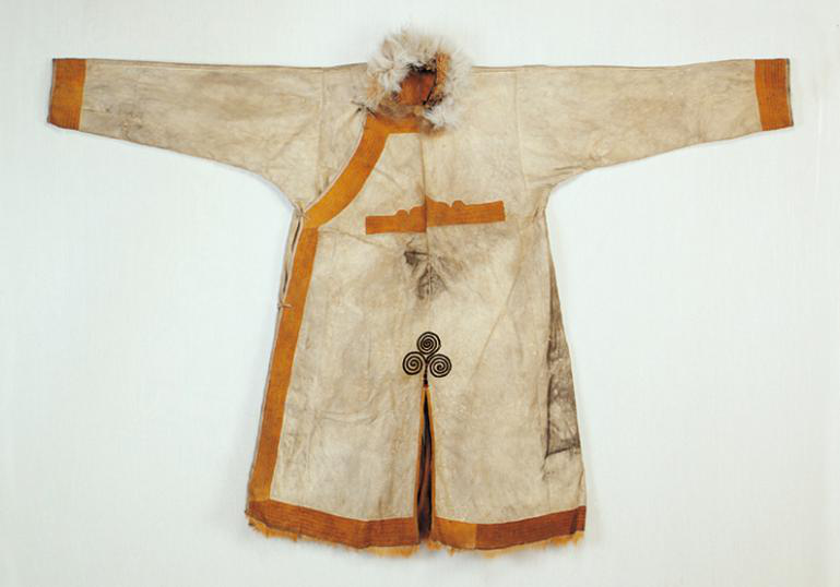 游猎时期鄂伦春人的服饰基本都是用兽皮制作的。用兽皮缝制衣服,首先要熟化兽皮,先把皮子晒干,将煮熟的狍肝捣烂,涂抹在皮板上再喷一些水,包好闷几天,使皮板变软。熟皮子时坐在地上,用双脚夹住皮子的一角,先用“克得热”(约二尺长的弧形带锯齿刮具)反复刮揉,待皮膜和污垢暴起,再用“毛担”(又称“毛贺得勒”,约二尺长的弧形钝刃刮刀)刮掉,就这样反复揉刮,直至皮板柔软且富有弹性为止。最后,几个人配合,将柔软的皮张放在朽木火上,一边熏烤一边均力拉伸,皮张就变得平平展展了(右图为鄂伦春传统服饰,头戴狍头帽,刘军供图)。