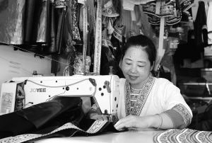 广西柳州市融水苗族自治县苗家小镇是一个易地扶贫搬迁社区,自2017年群众陆续入住以来,当地政府在加强和完善基本公共服务设施的同时,通过创办扶贫车间、成立小微市场和鼓励自主创业等方式,多措并举保障和提升搬迁群众的就业质量,目前已实现“一户一人就业”共1586户3824人,占总户数的98%。搬出大山的群众迎来了新的生活,开启了新人生。蒙琼丹是融水县杆洞乡杆洞村搬迁户,她在照顾两个小孩读书的同时开了家苗衣店,月收入2000元。图为8月30日,蒙琼丹在制作苗族服装。 龙涛摄影报道