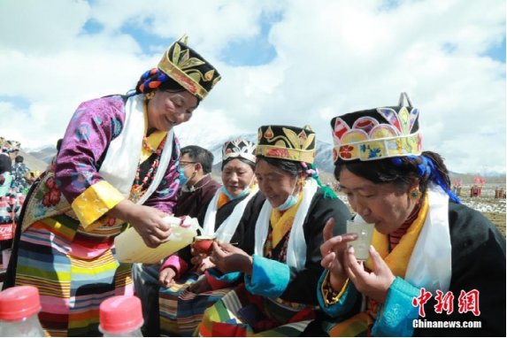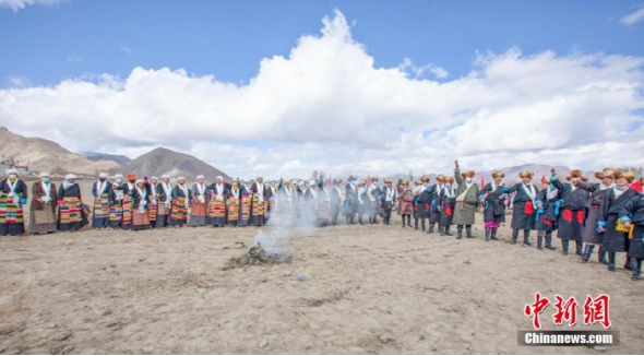 图为拉萨市林周县朱加村,村民穿着节日盛装举行传统春耕仪式。林周融媒 供图