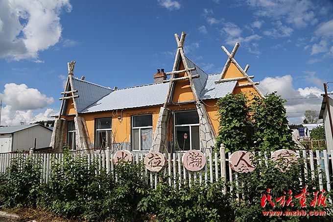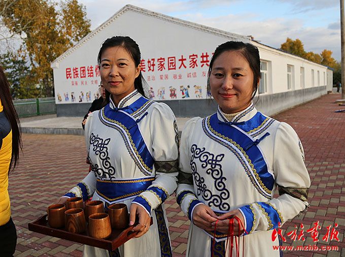黑河市爱辉区坤河达斡尔族满族乡的达斡尔族群众发展乡村旅游。图为村民用奶茶迎接宾朋。