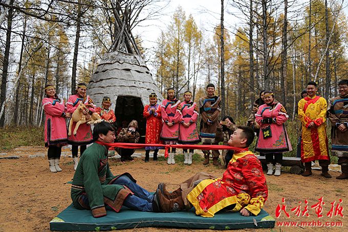 鄂伦春族传统民俗文化带动了乡村旅游发展。图为鄂伦春族传统婚俗表演。