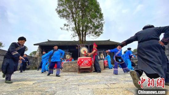 图为12月14日彭承金正在为摆手舞击鼓 周星亮 摄