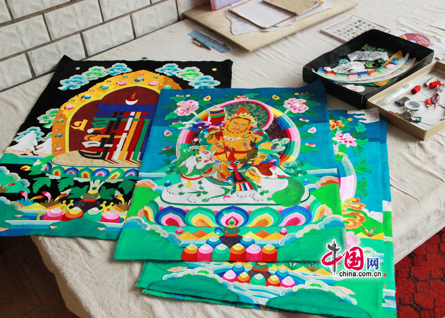 堆绣,藏语称“规唐”或“格支卜”。意为绸缎制作的唐卡,是一种运用“剪”“堆”等技法塑造形象的艺术,多用于唐卡制作,内容多以藏传佛教题材为主。珍藏在湟中县塔尔寺中的堆绣是藏传佛教艺术的瑰宝,被誉为塔尔寺艺术三绝之一,闻名遐迩。