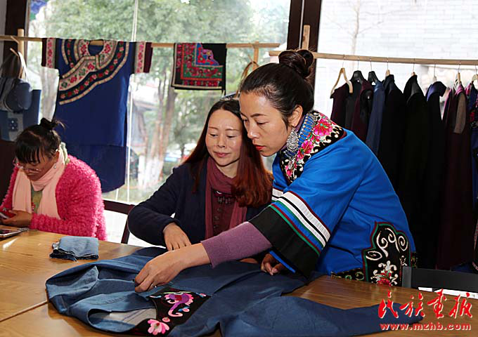 大姚县咪依噜民族服饰制品有限公司总经理罗珺给职工讲解彝族服饰文化