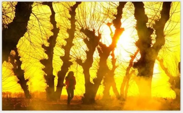 青葱一段。是那些仙柳,年年绿遍。亲瞻始信天工巧,看神态虬然,巨身如蜿。雕成寂寞,惯倚风沙思念。放眼,在芳陌之间,碧河之畔。痴怀不共斜阳挽,有归鸟缠绵,与它相恋。根生大漠,情系这般辽远。