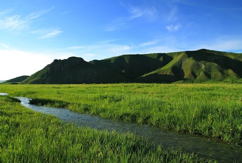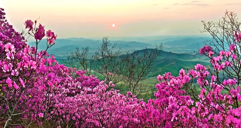 罕山五月杜鹃红,蜂蝶绕花丛。白桦亭亭玉立,翠枝仰望苍穹。茵茵绿草,牛羊遍谷,溪水淙淙。游客最佳去处,饮茶骑马登峰。