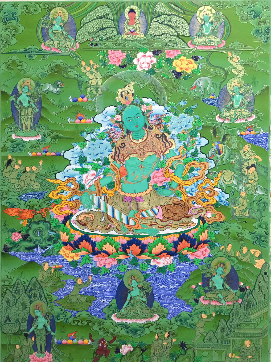绿度母即观世音菩萨之化身,为二十一度母之主尊,持通本尊咒,能总持二十一度母之功德。修持此尊密法,能断生死轮回,消除一切魔障、业障,并能消灾增福,延寿广开智能,凡有所求无不如愿成就,且命终往生极东世界。唐朝的文成公主咸信是绿良母的化身。