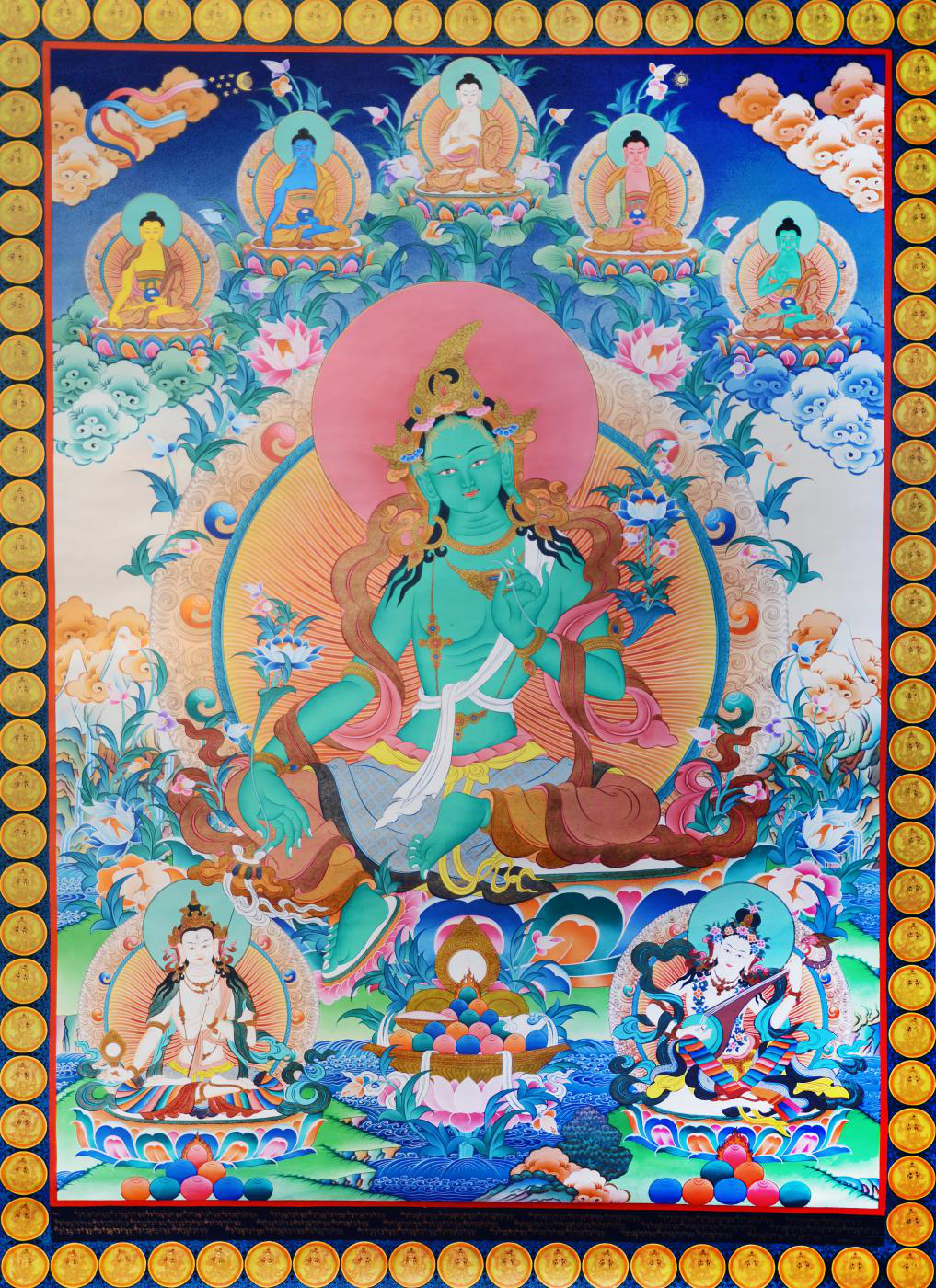 绿度母坐菩萨座于莲花月轮上,双脚屈左展右,左腿单坐,右腿向下舒展,踏在莲花上表示随时准备起身救度苦难众生,如慈爱的母亲一般,拯救钟爱的孩子;