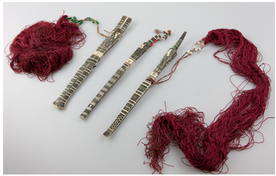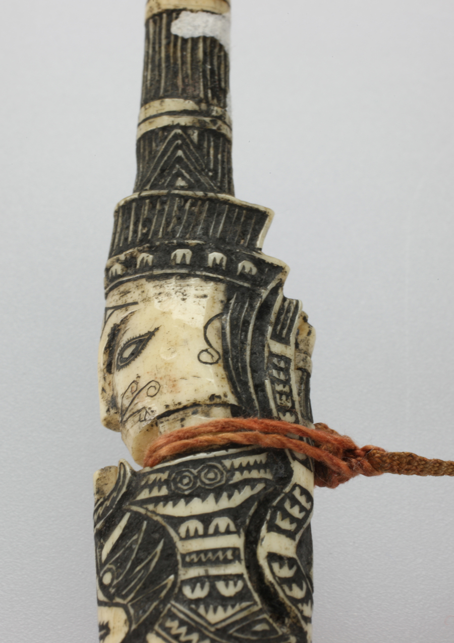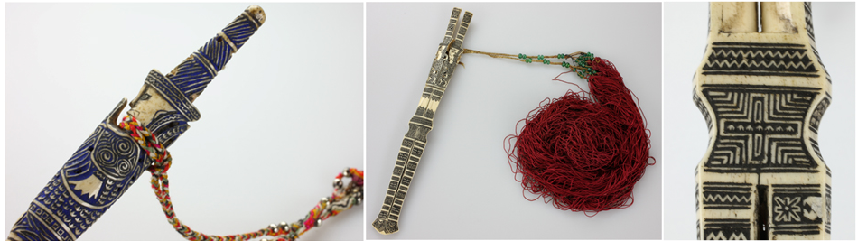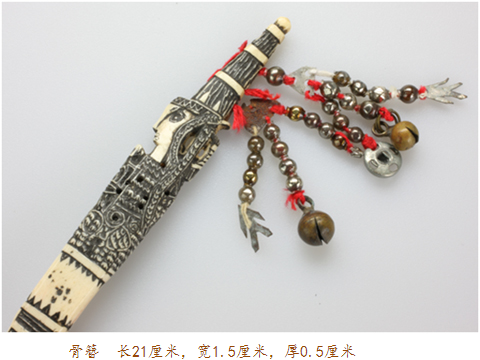 骨簪头部以下是充满几何感的水波纹、山形纹、米字纹、圆形纹,留白之处有鱼纹、花纹以及少许文字。文字或是雕刻者本人,或是其心爱之人。一般头像处或中部系有几束彩色料珠的红缨穗饰物用以盘绕发髻上,或是以银铃、银片来装饰。