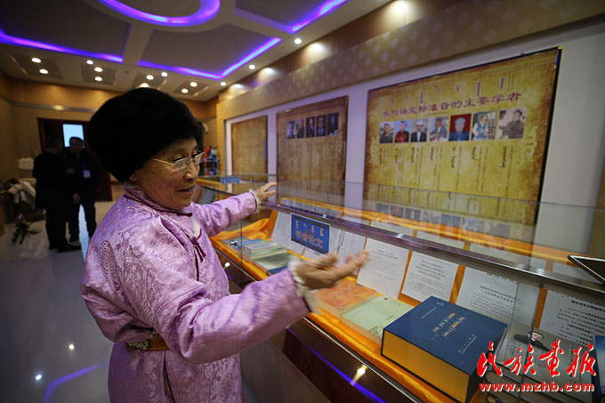 其木格老人向参观者介绍正蓝旗方言被确定为中国蒙古语标准音的历史