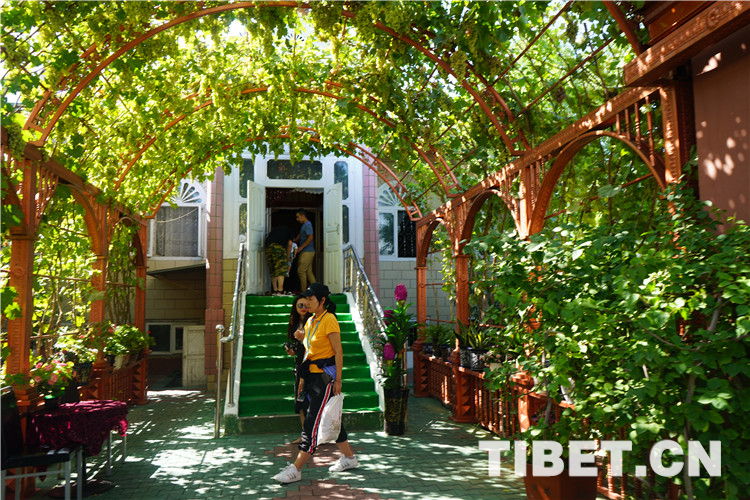 除了古老的纯木质结构民宿,喀赞其还有各式砖石结构的民居。院落宽敞明亮、华丽气派,家家种植着花草、蔬菜,郁郁葱葱、生机盎然,葡萄廊架已成为每家的“标配”,葡萄架下是家人休闲、朋友聚会的地方。图为当地民居院内。