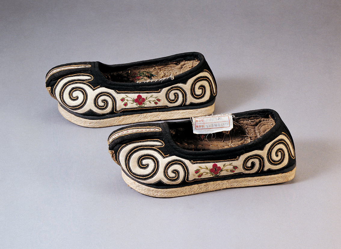 土族民国时期云纹双梁绣花男布鞋,中央民族大学民族博物馆馆藏