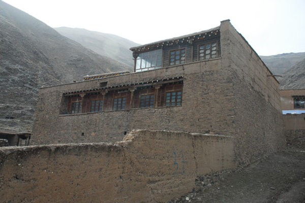 “碉院”则是一组较大的综合性建筑,一般三层,局部四层,平面为四全院式,中间有较大的天井内院,设小花坛,可种树木花卉。内院四周设回廊,石砌外墙用全封闭,除了门洞,墙上开少量小窗。底层为牲畜圈、杂用房;二层多为仓库、接待房、佣工房等;三层为卧室、厨房和粮仓、珍宝库;四层为经堂、佛堂、经书库。有的在外墙女儿墙部分刷以黑色或棕色圆珠图案,窗上檐一层或二层方椽挑出,作为传统式藏窗形式,丰富了立面,改变了石墙面之笨拙感。