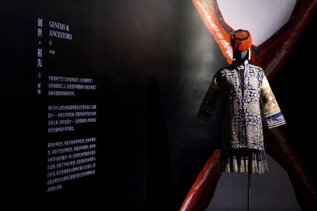 展览呈现了在传统服饰中,这些哲学难题被针与线在不同历史时期交织成具象图案和抽象符号——对于创世与祖先,对于人与神、天与地,传统服饰成为苗、瑶、彝、侗等民族书写与描摹的材料;服饰之上精美的纹饰,展现出这些民族心中神灵的形象,勾画出民族英雄的事迹,从而建立起关于自我认识的图景,生发出对宇宙的敬畏。