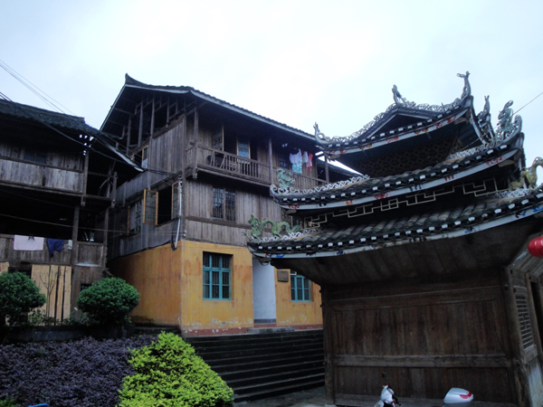 寨里建有两坐鼓楼,相距二十米,分别为头寨鼓楼和尾寨鼓楼,有人称之为龙凤鼓楼。位于现戏台两侧。鼓楼是侗族特有的民族文化象征和标志。哪里有侗族,哪里就有鼓楼。鼓楼飞阁垂檐,内部由四根巨大的杉木贯顶,与周围的木柱、横梁组成复杂的网状结构,层层而上呈宝塔形状。侗族建筑师技艺高超,几十米高的鼓楼建造不用图纸,主材尺度确定后,其它材料的长短按秘传口诀即可算出,凭着一根丈杆,一支墨笔,错综复杂的金瓜梁枋、斗拱支柱,以杉木开糟穿榫插接而成,不用一钉一铆,衔接丝毫不差,历经风雨,百年不倒。为了装饰、防腐,在鼓楼的外额上彩绘或泥塑龙凤鸟兽、古今人物,以及侗族生活风情的油饰图案,造型栩栩如生,内容琳琅满目。鼓楼是侗族人民娱乐、仪事的公共场所,为侗族多元文化之载体。楼中最高层的中心摆设一桦树牛皮大鼓,凡有重大事宜商议,起款定约,则击鼓以号召群众。