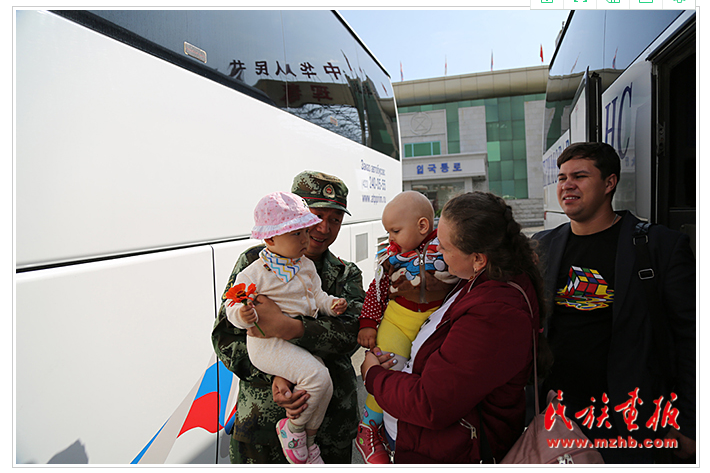 第一次来珲春旅游的俄罗斯游客亚娜带着她1岁的宝宝刚入境,恰巧遇到带孩子出来的中国边防战士,他们便打起了招呼