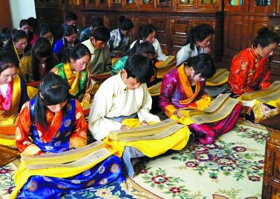 西藏藏医学院的学生正在研读记载着藏医药浴法相关知识的《四部医典》。刘罡 摄