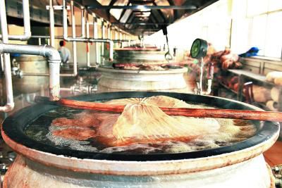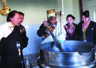 该遗产项目代表性传承人明珠(左)指导泷沐觉堪(制药师)煎熬“五味甘露”。关确才让 摄