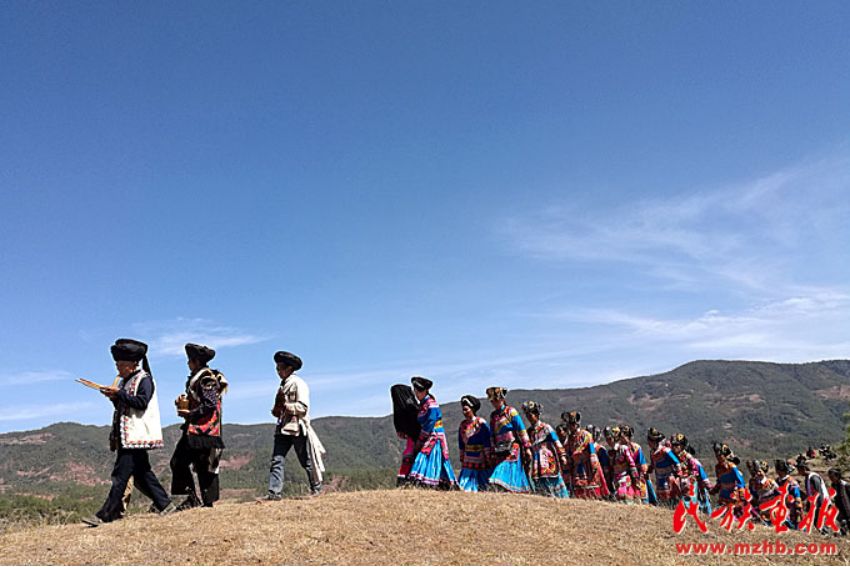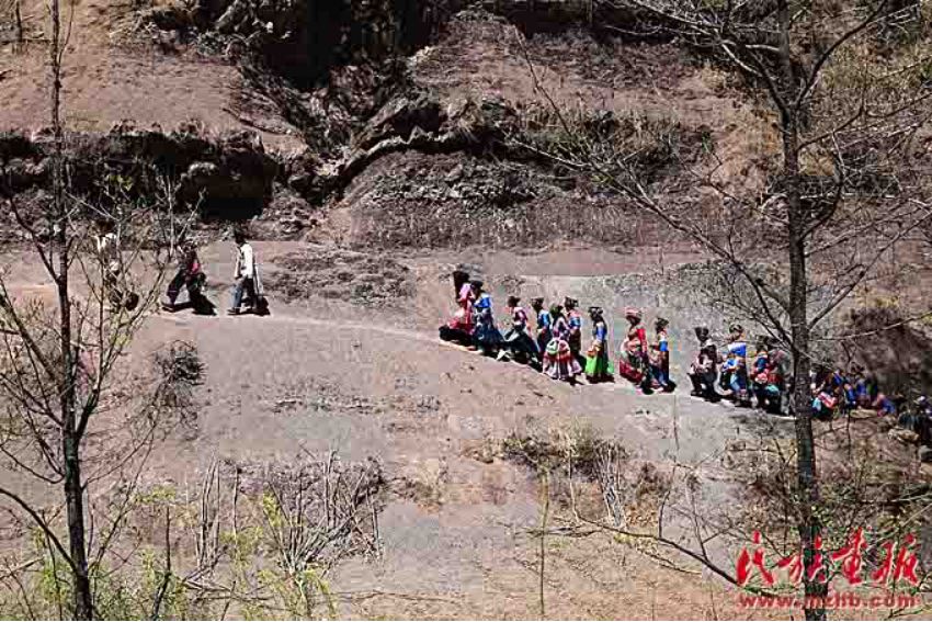 送亲的队伍走在崎岖的山路上
