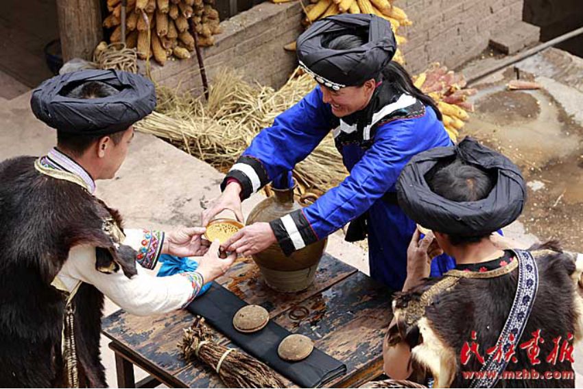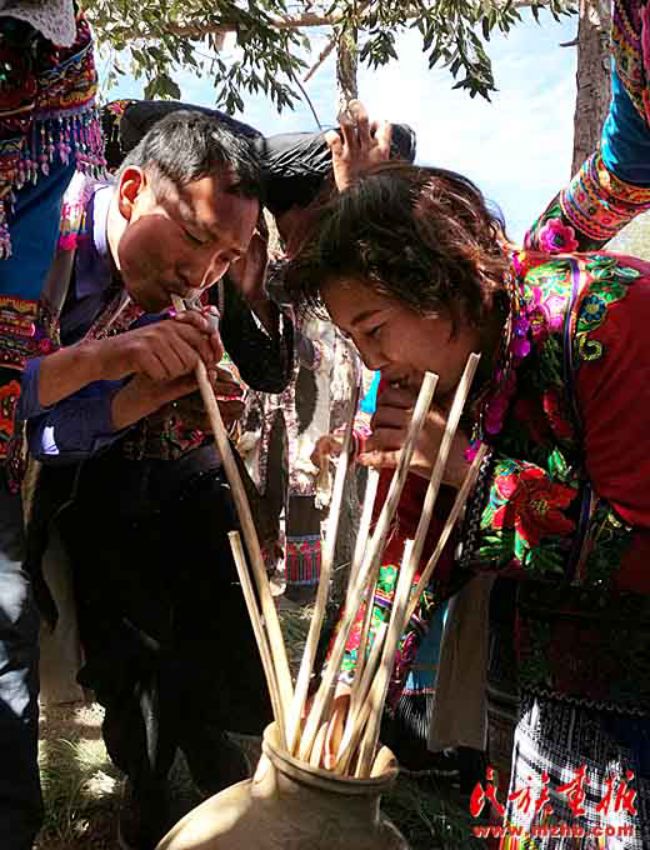主人家抬出几大坛米酒,拿出几十根空心麻杆插入坛内,供吸吮米酒