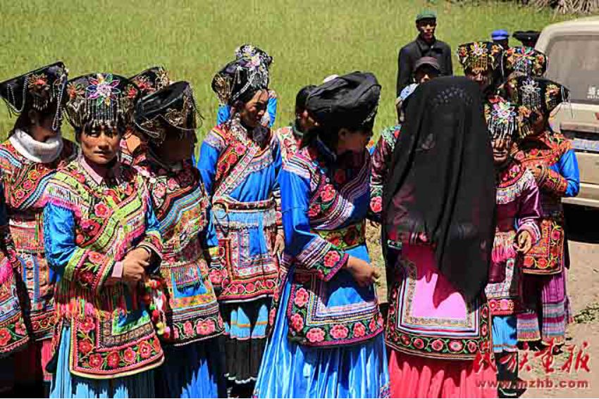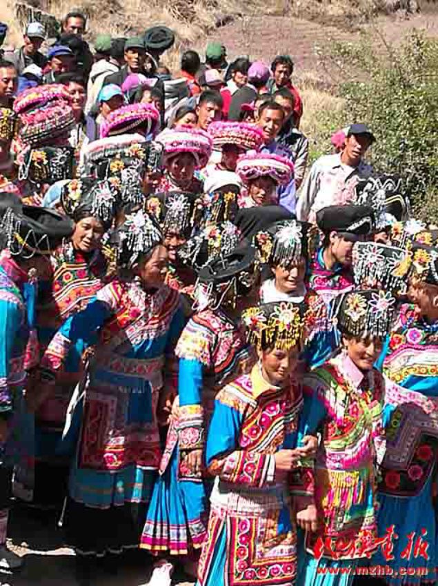 身着艳丽服饰的送亲队伍