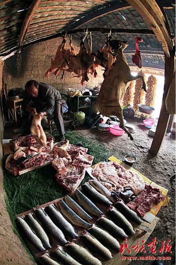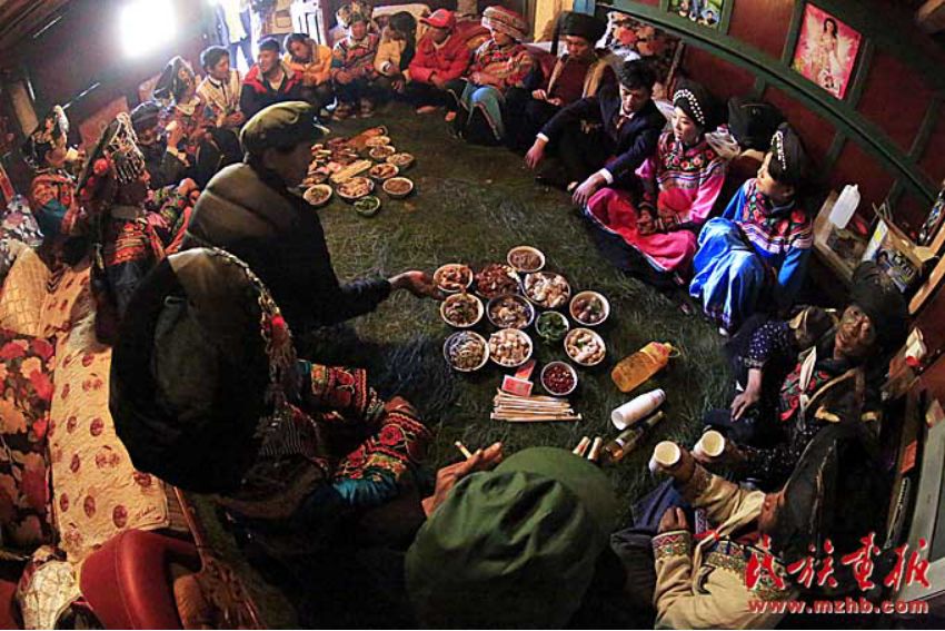 宴席一般不用桌子,酒菜摆在青棚下面铺好青松毛的地上