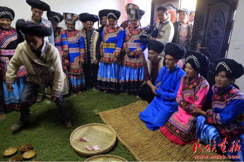 一番热闹之后,大家坐定,主婚人向女方父母过彩礼,这时,伴娘为新娘子换上新衣服。女方家早已为接亲人准备好丰富的宴席,尽兴喝酒,尽情用膳,其乐融融。饭后,男女双方围成圆圈边舞边歌,歌词大多是女方对男方提出的一些难题,而有备而来的娶亲队伍中的歌手,往往对答如流,直到娶亲人取得胜利,才准接走新娘。临走时,娶亲队伍一行人要在女方家打跳三转,再到外场子里跳舞,以示新娘对娘家依依不舍之情。一切准备就绪,娶亲人、送亲人和新娘就一同朝男方家进发。