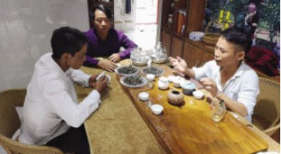 岩少忠(右一)和村民“斗茶”。郭家翔摄