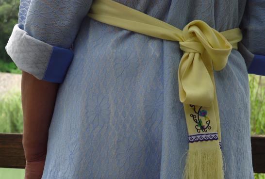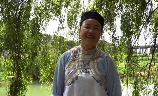 斜襟短衣外的围腰上部与斜翼两侧鸟兽花纹,围腰大部分为纯色,色彩选择较多。而垂在腰后的彩带尾部有流苏,助以美观和装饰。