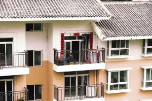 搬进城中安置房后,在阳台上依然制衣的妇女。