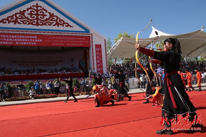 射箭是游牧民族在过去的游牧生活中必会的生存本领之一,哈萨克族的射箭也是传统的体育竞技项目。图为阿克塞之鹰2017年丝绸之路骑射国际大学生邀请赛上,学生的射箭展示