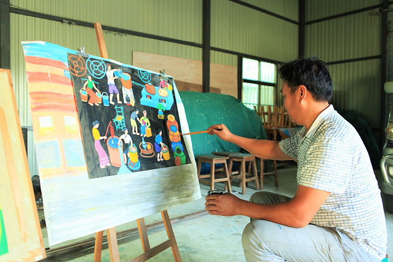 喊沙寨的农民画家吞也正在作画,画中描绘的是傣族群众的酿酒过程