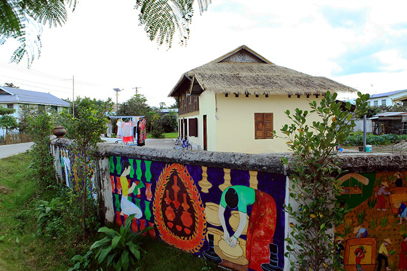 喊沙寨里的彩色画墙和傣家竹楼