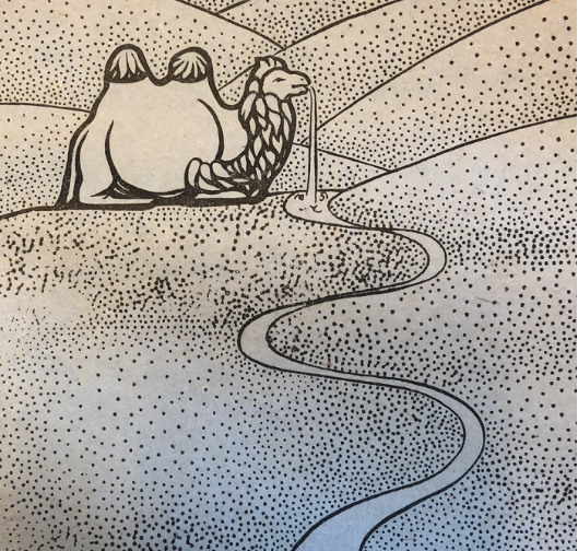 高兴之际,大家想起了驮经驮水土的骆驼;但是人们四下里一看,白骆驼不见了。真是,为了找水喝竟把劳苦功高的骆驼丢失了!大家找呀,找呀,找了一夜还没找到,天亮时,又回到烧茶的地方,然后顺水而上,继续寻找。走不多远,发现骆驼在前面静静地卧着,人们高兴极了,有一个人三步两步跑上去拉骆驼,可是骆驼一动也不动。众人上前详细一看,白骆驼已变成了石头。那石骆驼在水里卧着,一股清水从它的嘴里喷出来,散发看清香的气味,流向远方。